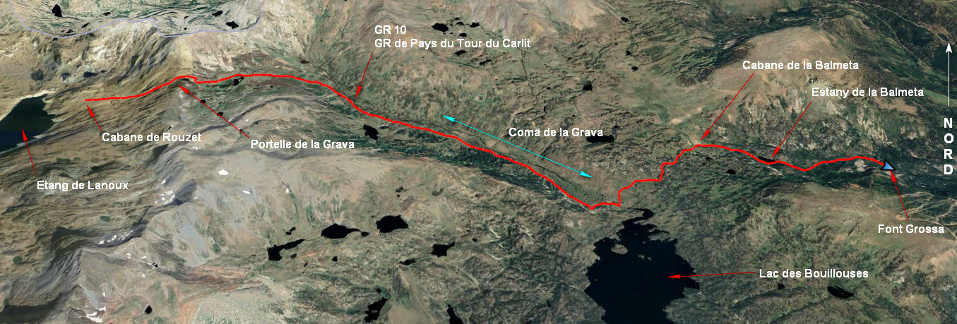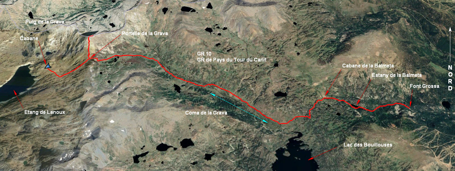 Cabane de Rouzet 2260 m - Portella de la Grava 2426 - L'Estanyol 2297 m - Passerelle 240 m - Cabane de la Balmeta 2110 m - Estany de la Balmeta 2047 m - Font Grossa 1900 m