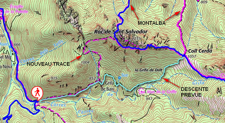 Sur le site IGN le sentier descendant du Col de Cerda n’est plus représenté en rouge, et le sentier contournant le Roc de Sant Salvador et descendant vers le Mas Pujol est représenté en rouge.