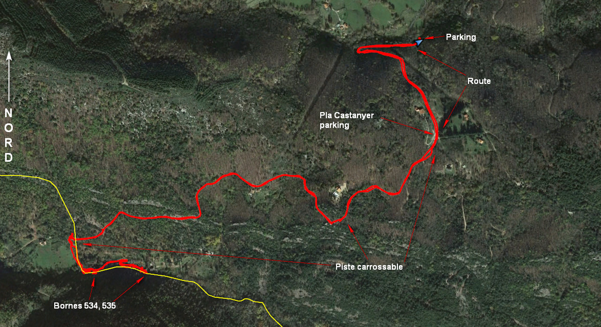 Du Pla Castagné poursuivre sur la piste carrossable, à une centaine de mètres du parking prendre la branche de droite. La suivre jusqu’à son terminus. Franchir un petit portail sur la droite et tourner à gauche immédiatement après celui-ci et descendre jusqu’à la Muga. La borne frontière 534 se trouve sur la rive droite au-dessus d’une banquette rocheuse.