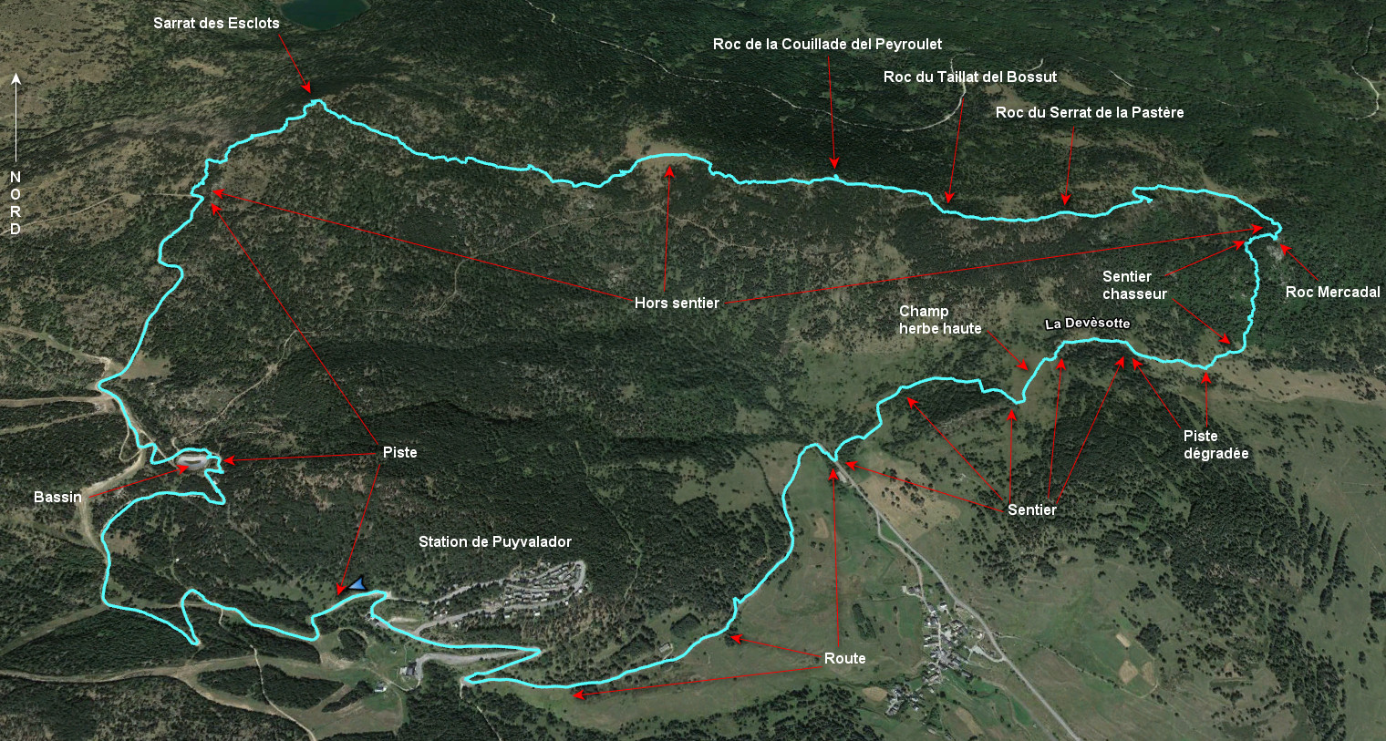 Du Roc Mercadal, partir vers l’ouest, puis assez rapidement obliquer au sud pour descendre le long d’un petit ruisseau, il était presque sec, par des sentiers de chasseurs. Après avoir traverser la Soula des Canals, on débouche dans une grande zone à découvert, garder la direction sud jusqu’à trouver une piste et la suivre vers la droite. Elle disparait peu avant d’arriver à une clôture. La franchir et poursuivre par le sentier qui fait suite dans le bois. Peu après la sortie du bois, on traverse la Devèsotte, passer une deuxième clôture et obliquer au sud-ouest pour traverser un grand champ, herbes hautes, jusqu’à trouver un sentier proche d’un muret en pierres, le suivre vers la droite et le conserver jusqu’à la route d’accès à la station. La suivre pour revenir au point de départ.