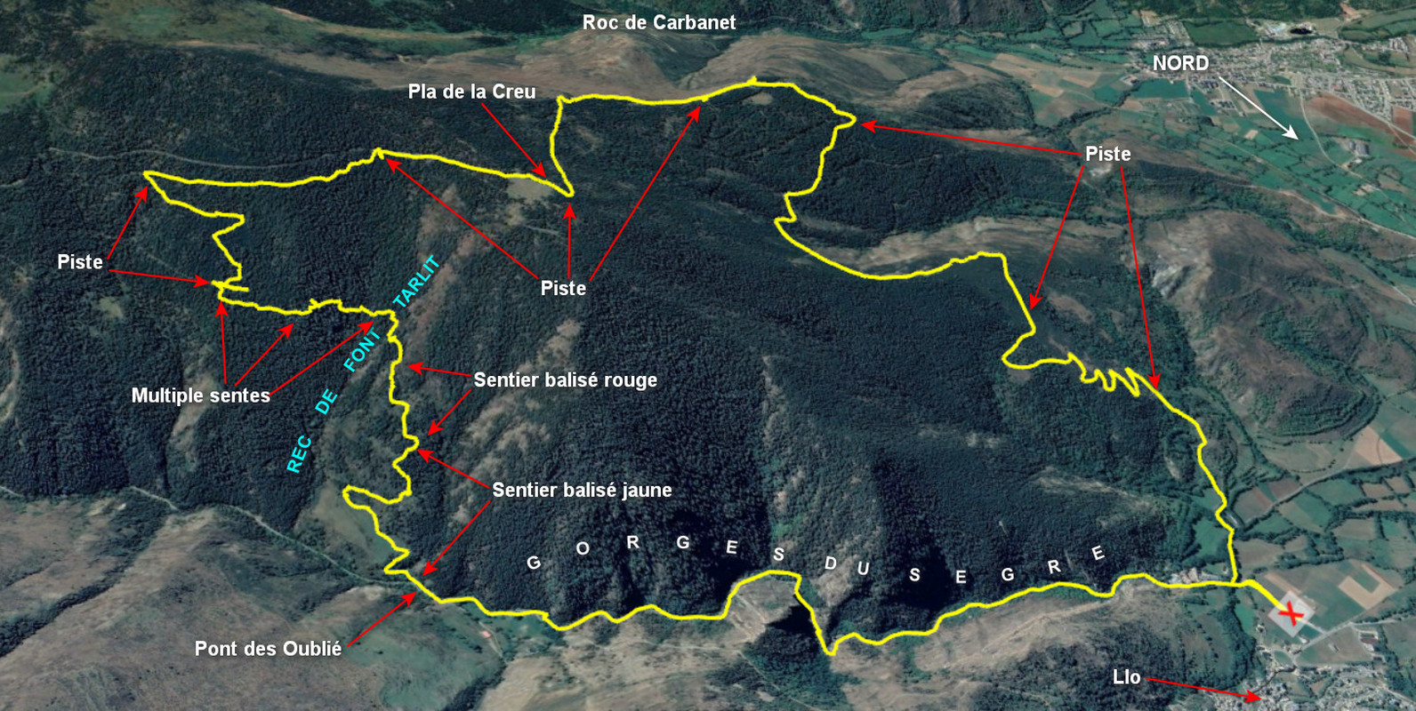 Remonter les Gorges du Sègre jusqu’au Pont des Oubliés, traverser le pont faire une cinquantaine de mètres et prendre sur la droite le sentier balisé jaune de la Boucle des Maquisards, panneau dégradé. Après une première partie à découvert le sentier rentre dans la forêt avec une nette accentuation de la pente suivi d’un replat à environ 1690 m. Au début de ce replat quitter le sentier pour monter sur la gauche, on trouve très vite un sentier balisé rouge. Suivre ce balisage jusqu’à une flèche rouge gravée sur un arbre, ne pas tourner sur la droite, continuer tout droit on trouve à quelques mètres un autre balisage rouge. En suivant le tracé gpx, traverser le Rec de Font Tarlit vers 1830 m, toujours par un jeu de sentes peu empruntées mais facile à suivre on rejoint une piste forestière vers 1880 m. Prendre sur la droite sur quelques dizaines de mètres et sur la gauche un raide et large passage, le conserver jusqu’à 2000 m, plutôt que de suivre le sentier vers la droite il est préférable de monter vers la piste venant du refuge de la Culassa, une vingtaine de mètres environ. Ce cheminement improvisé dans la forêt est magnifique et propice à la rencontre de cervidés.