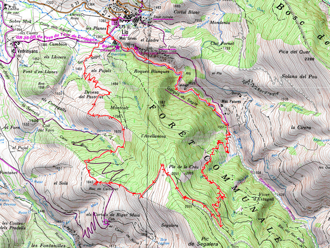 Llo 1392 m - Pont des Oubliés 1551 m - Bifurcation 1720 m - Rec de Font Tarlit 1830 m - Piste 2050 m - Pla de la Creu 2051 m -