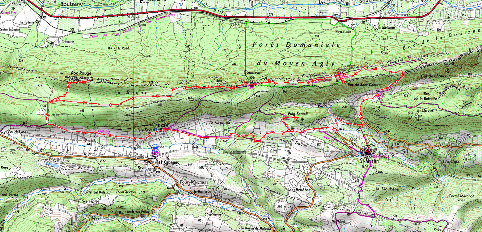 Saint-Martin-de-Fenouillet D7 430 m - Abri 506 m - Table d'orientation 635 m - Roc de Sant Canis 652 m - Couillade de Ventefarine 635 m - Piste 671 m - Bifurcation 566 m - Roc Rouge 661 m -
