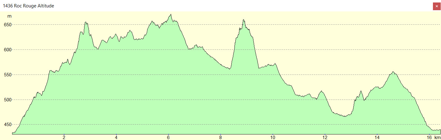 Revenir au sentier et poursuivre vers l’ouest. Laisser un premier sentier descendant sur la gauche, puis quelques minutes après la Couillade de Ventefarine, abandonner le sentier balisé jaune qui descend vers Fosse pour prendre sur la droite le sentier avec un balisage rouge plus grossier. Ce sentier est d’une qualité inférieure au précédent mais ne présente pas de difficulté particulière. Le suivre sur 1 kilomètre, il se finit en débouchant sur une piste, la suivre vers la gauche sur 2 kilomètres, on arrive à un nœud de pistes. Prendre la piste la plus à droite, puis le sentier qui lui fait suite avec quelques balisages et cairns. À la fin du balisage, obliquer sur la droite, suivre un cheminement parallèle à la crête pour finir de monter au Roc Rouge.