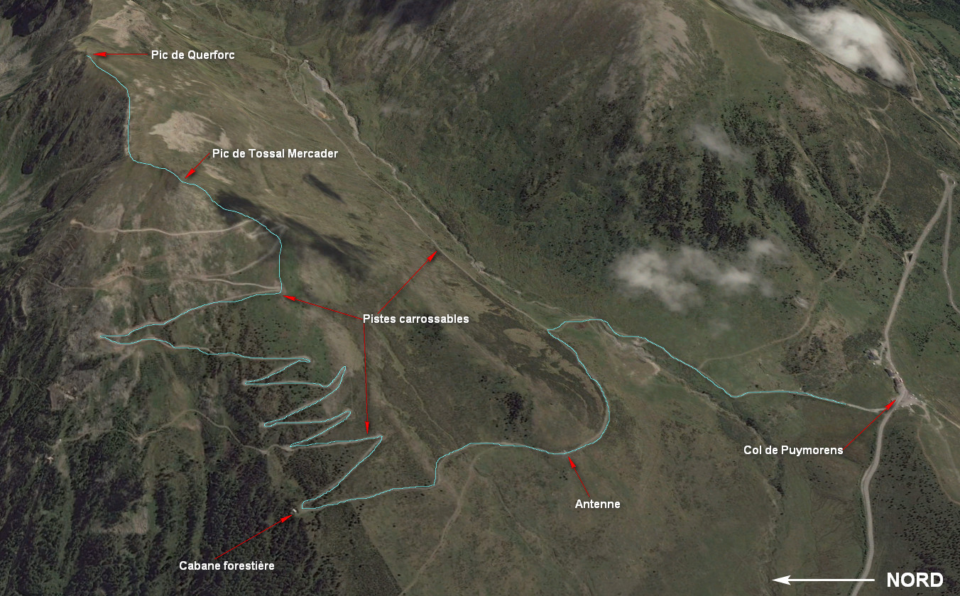 On peut se garer directement au col, parking côté sud de la route ou faire quelques centaines de mètres sur la piste côté nord de la route. A 1 kilomètre du col laisser la piste remontant la Coma d’en Gracia sur la droite pour continuer sur celle de gauche. A 2350 m d’altitude quitter la piste pour monter directement vers le sommet du Pic de Tossal Mercader. Du sommet suivre le fil de la crête ou le chemin légèrement en contre bas de celle-ci pour aller jusqu’au Pic de Querforc.