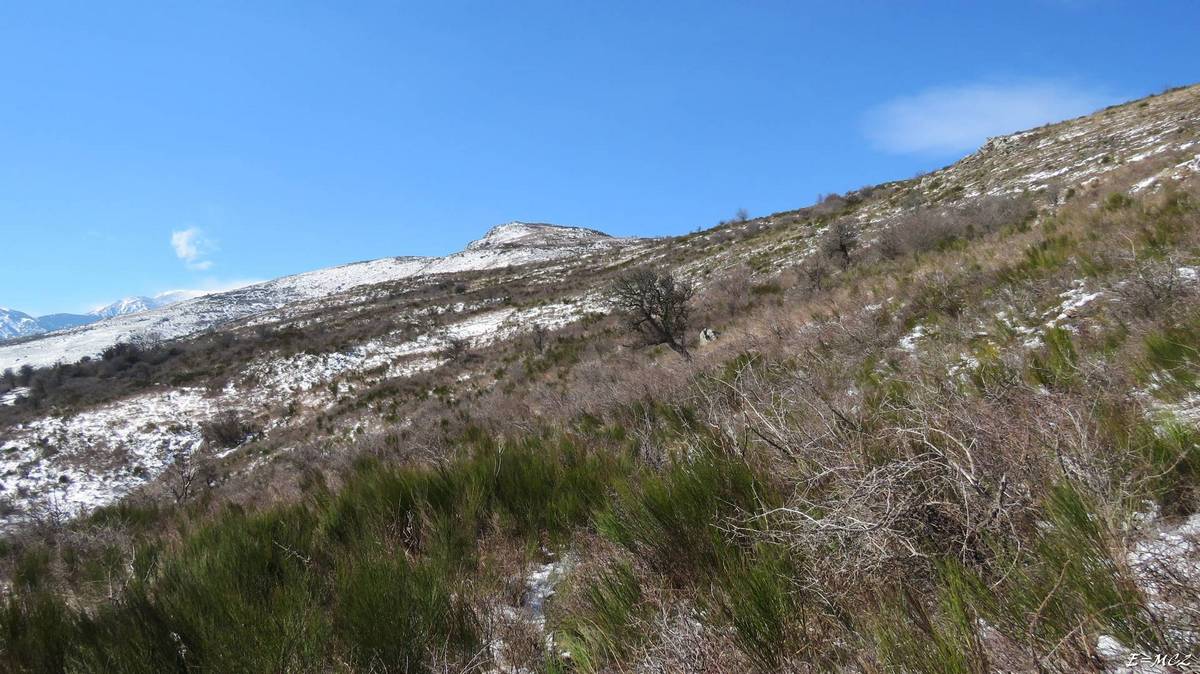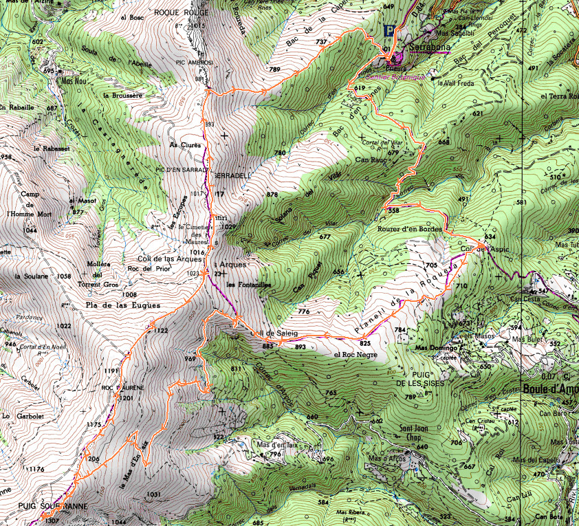 Prieuré de Serrabonna 600 m - Coll de l'Aspic 634 m - Coll de Saleig 885 m - Crête 1220 m - Puig Soubiranne 1307 m - Col 1175 m - Roc d'Aurène 1201 m -