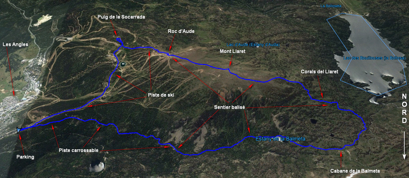 Pas de problème d’itinéraire pour cette randonnée. Du parking rue de la piste verte prendre vers l’ouest la direction de l’Estany de la Balmeta par la piste carrossable jusqu’à la Font Grossa, source captée, et ensuite par le sentier balisé. Longer l’étang par sa rive gauche pour continuer vers la Cabane de la Balmeta. De la cabane suivre le sentier bien panneauté et balisé en direction du Mont Llaret et du Roc d’Aude par le Corrals del Llaret. Du Mont Llaret poursuivre toujours par le sentier balisé pour arriver au Roc d’Aude sans plus de difficulté qu’au Mont Llaret. Descendre au sud est en suivant le téléski San Père puis la piste bleue Soucarrade puis obliquer au sud pour aller jusqu’au Puig de la Soucarrade, de peu d’intérêt. Revenir au nord, passer par la gauche ou par la droite de l’arrivée du télésiège du Pla del Mir et suivre la direction « Secteur Jacettes –Retour station » pour revenir par la piste de ski verte au point de départ.