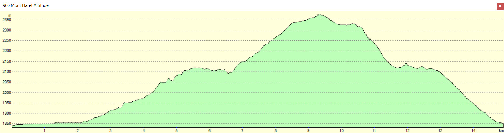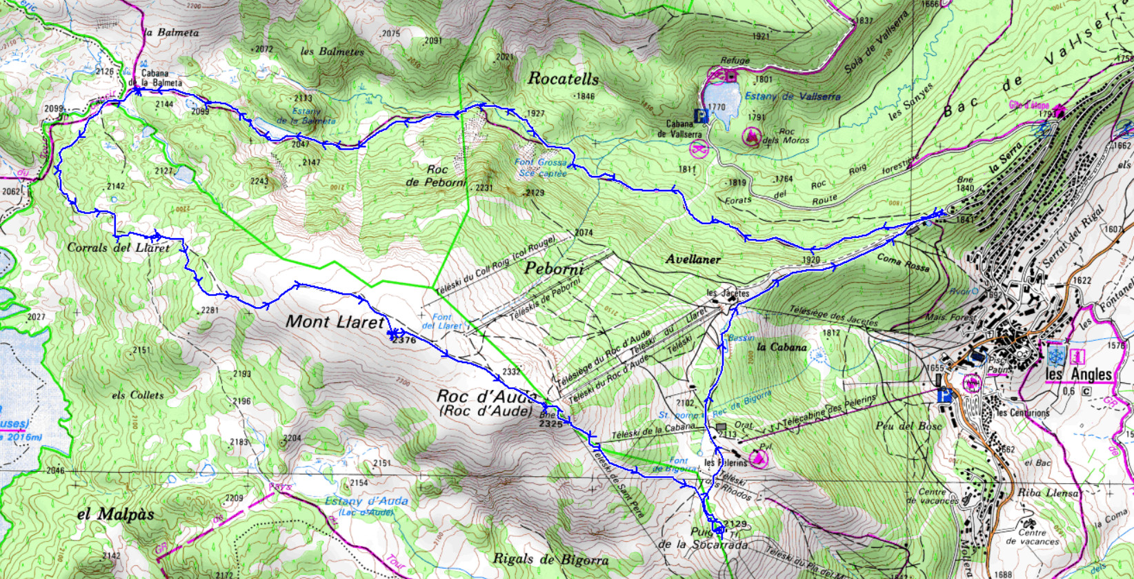 Les Angles 1840 m - Estany de la Balmeta 2047 m - Cabana de la Balmeta 2120 m - Corrals del Llaret 2200 m - Mont Llaret 2376 m - Roc d'Aude 2325 m -