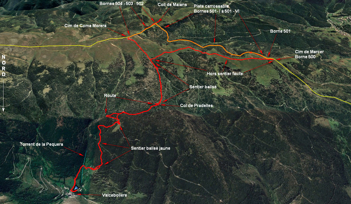 Revenir vers le début du parking et prendre sur la droite le « Chemin de la Retirada », le suivre pendant cinq minutes et obliquer sur la droite, aussitôt la clôture passée, pour prendre un sentier plus herbeux et plus humide, le suivre pendant cinq minutes et obliquer à droite, pour traverser le Torrent de la Pequera. Poursuivre sur le sentier caillouteux au début puis moins évident, en herbe, pour au niveau des Planelles, prendre un bon sentier balisé jaune, traverser une piste et continuer jusqu’à la Jaça de les Corones. Ensuite, en laissant la route vers la Borne 504, continuer jusqu’au Col de Pradelles. Du col suivre l’itinéraire de la Borne 504 jusqu’à 2100 m, c’est-à-dire à la sortie du Bosc de les Font et partir à l’est sur le grand plateau, traces de sentier, traverser le Ras de la Vasseta, les deux Bornes 500 et 501 se voient d’assez loin.