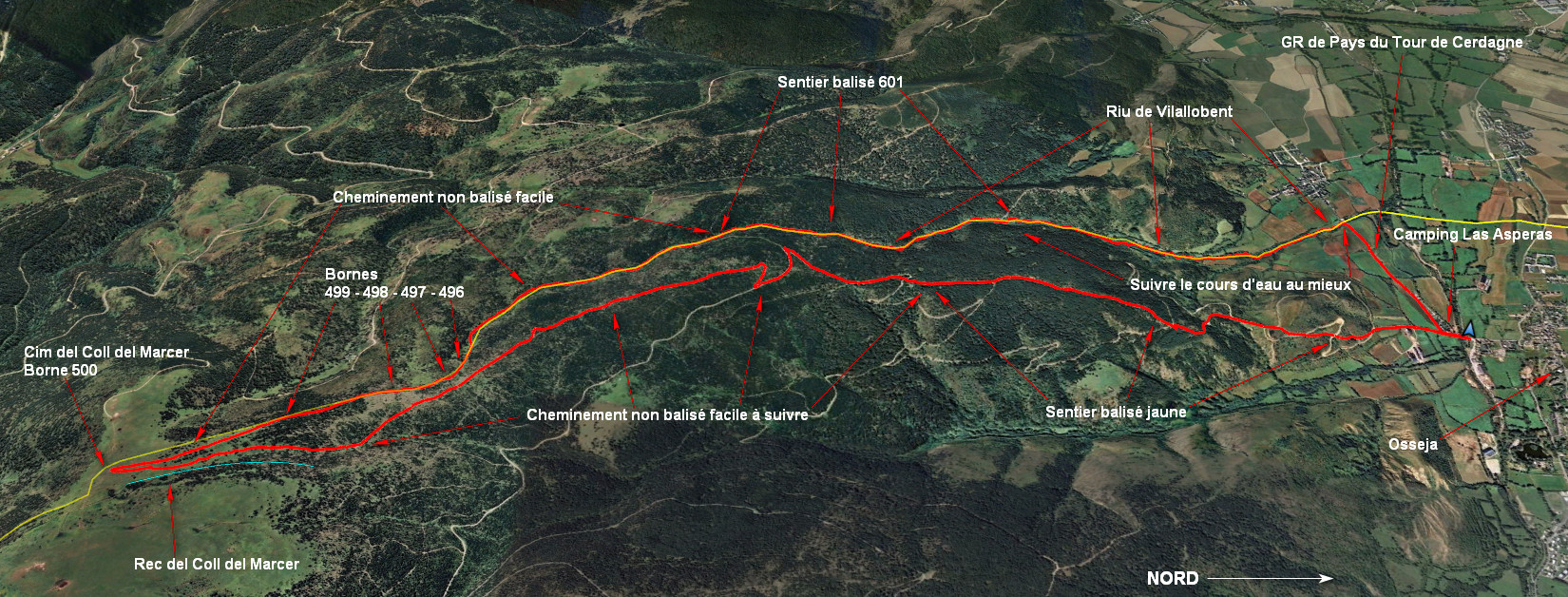 Du parking passer devant l’entrée du camping Las Asperas et prendre la direction de Vilallobent par le GR de Pays du Tour de Cerdagne, jusqu’à rejoindre le Riu de Vilallobent. Remonter le lit de ce ruisseau qui sert de frontière. Louvoyer entre rive droite et rive gauche, sans trop de difficulté, il y a toujours un passage qui permet de rester au plus près de la frontière. Vers 1390 m, on croise une piste, à partir de là le cheminement s’améliore, un bon sentier suit la frontière, balisé 601, à la fin du balisage 601, continuer à remonter le cours d’eau. On trouve les bornes 496, 497, 498, 499 facilement. Lorsque le ruisseau disparait continuer de suivre le sentier en restant à proximité de la clôture présente depuis le début. Rejoindre la Cime du Col de Marcer et la Borne 500, ne présente pas plus de problème, sur la fin la clôture s’éloigne du fil de la frontière.