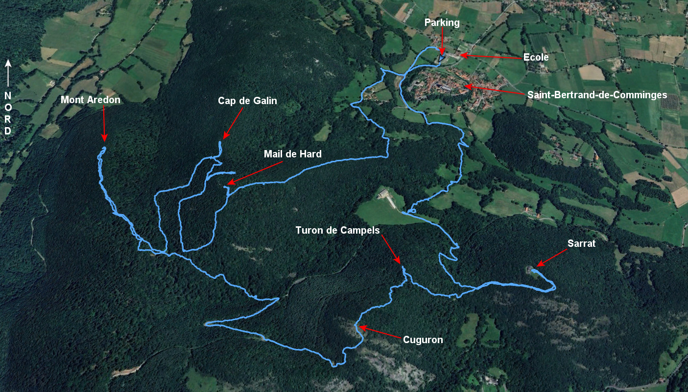 Du sommet, descendre hors sentier vers le nord-est et monter au Turon de Campels. En revenant vers le col qui précède le sommet, on a trouvé une sente qui semble abandonnée. Elle est assez raide et envahie par la végétation mais reste encore visible et assez facile à suivre. Elle nous a permis de rejoindre la piste qui relie le village d’Aveux au sommet de Sarrat. La suivre vers la gauche jusqu’à ce sommet. Revenir par la piste et prendre sur la droite, la piste VTT 8, « CAMIN DU BOIS DE SARP ». Après une courte montée, le sentier descend jusqu’à la route, la suivre vers la gauche sur 200 mètres, prendre sur la droite une piste sur une centaine de mètres et descendre sur la droite rive gauche d’une sorte de fossé, cela permet de rejoindre une grange en ruine, Millas, à partir de laquelle un sentier permet de revenir à Saint-Bertrand-de-Comminges. Contourner le village par la gauche pour revenir au point de départ.