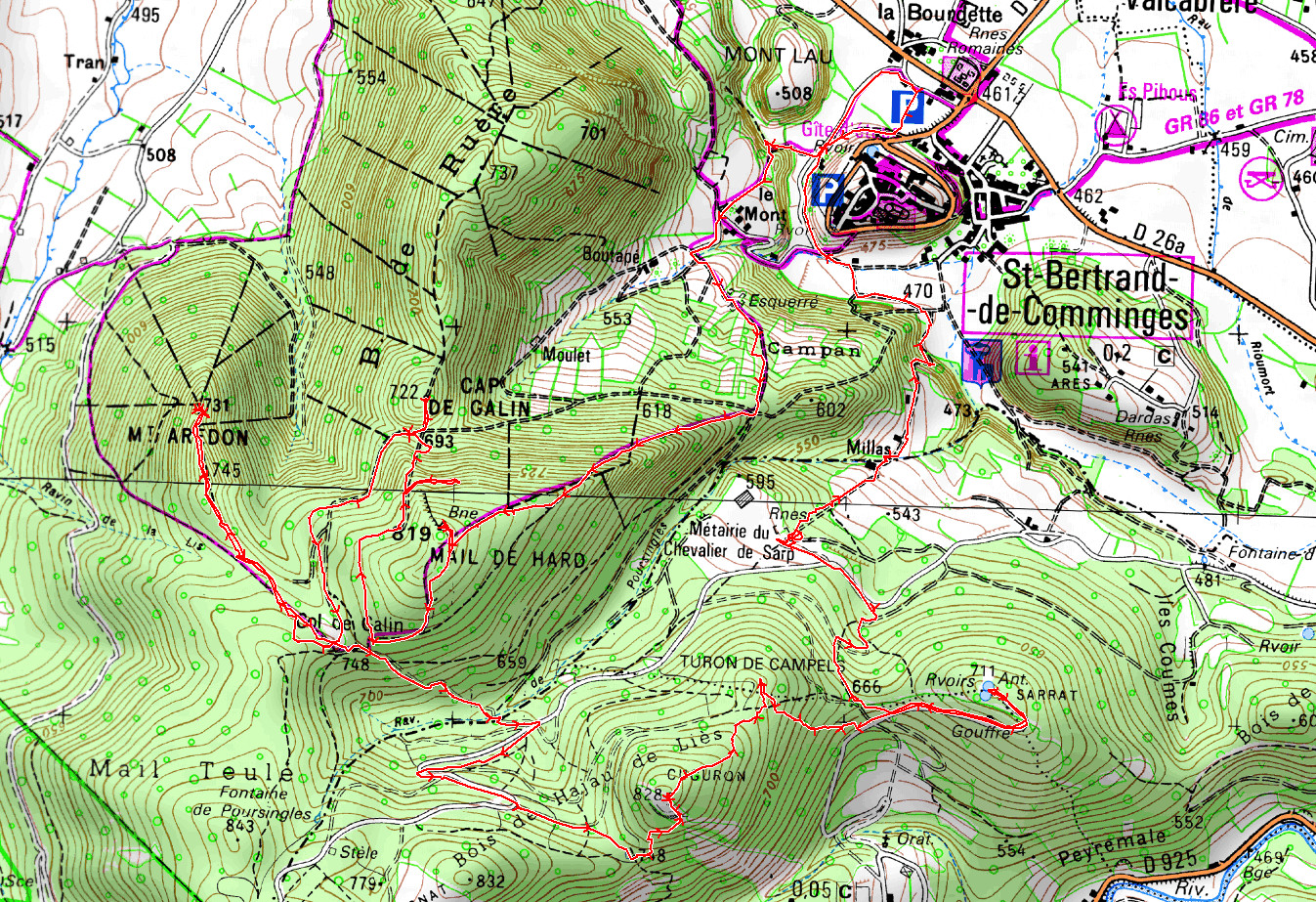 Saint-Bertrand-de-Comminges 460 m - Mail de Hard 819 m - Bifurcation 760 m - Col 693 m - Cap de Galin 722 m - Col de Galin 748 m - Bifurcation 730 m - Mont Aredon 731 m - Col de Galin 748 m - Route 670 m -