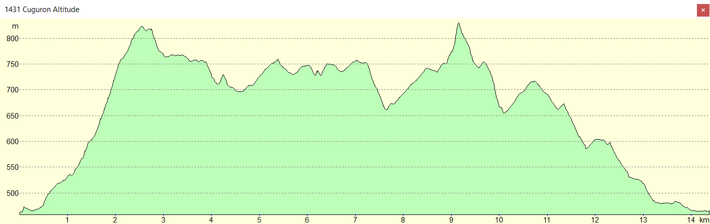 Piste 740 m - Cuguron 828 m - Turon de Campels 755 m - Piste 640 m - Sarrat 711 m - Sentier 650 m - Route 580 m - Millas 530 m - Saint-Bertrand-de-Comminges 460 m