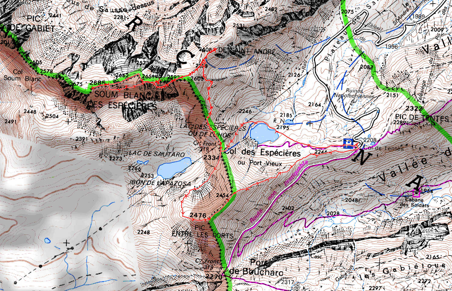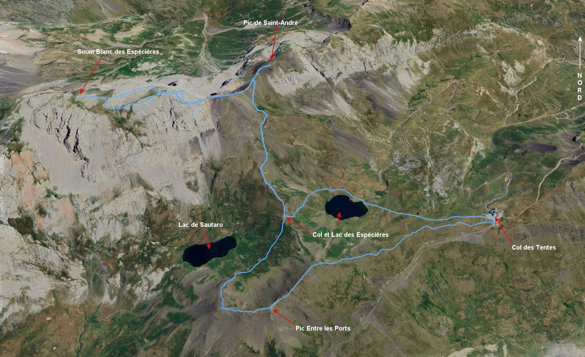 Col des Tentes 2207 m - Lac des Espécières 2195 m - Col des Espécières 2334 m - Col 2529 m - Soum Blanc des Espécières 2685 m - Col 2529 m - Pic de Saint-André 2608 m - Col des Espécières 2334 m -