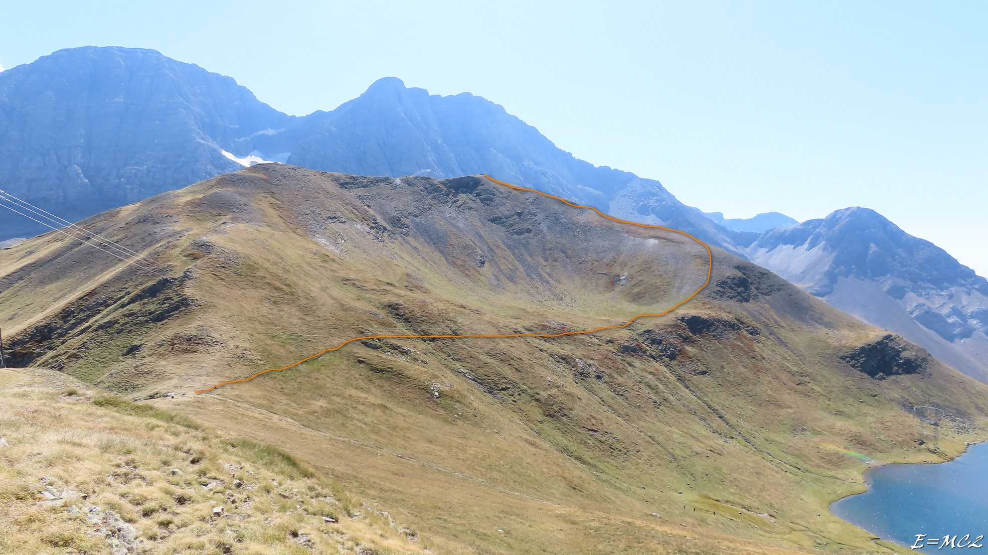 Du sommet, pour revenir au Col des Tentes, suivre la ligne frontière vers le nord-est jusqu’au point 2454 m où elle se divise en deux, prendre la branche de droite et la conserver jusqu’au point de départ.