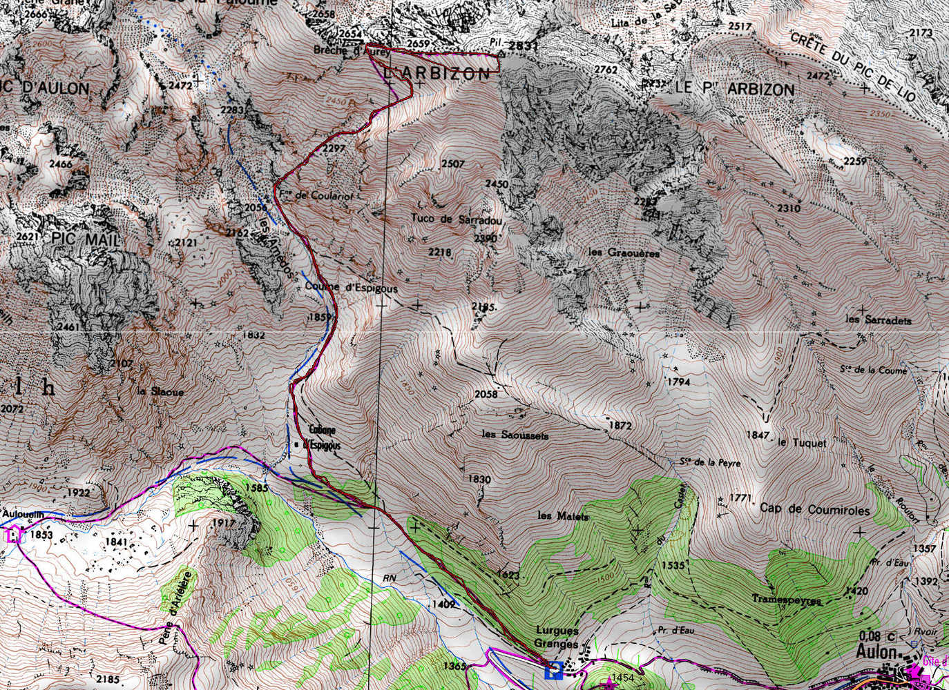 Granges de Lurgues 1380 m - Bifurcation 1570 m - Cabane d'Espigous 1660 m - Fontaine de Coulariot 2080 m - Brèche d'Aurey 2600 m - Pic de l'Arbizon 2831 m -