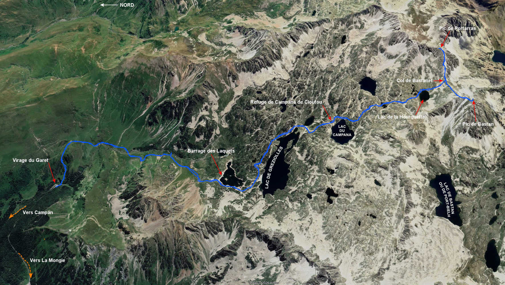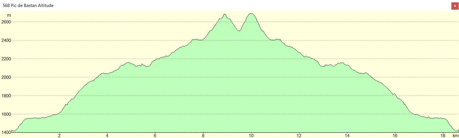 Parking du Garet 1430 m - Barrage des Laquets 2041 m - Lac de Gréziolles 2113 m - Refuge de Campana de Cloutou 2215 m - Lac de la Hourquette 2405 - Col de Bastanet 2507 m - Pic de Bastan 2718 m -