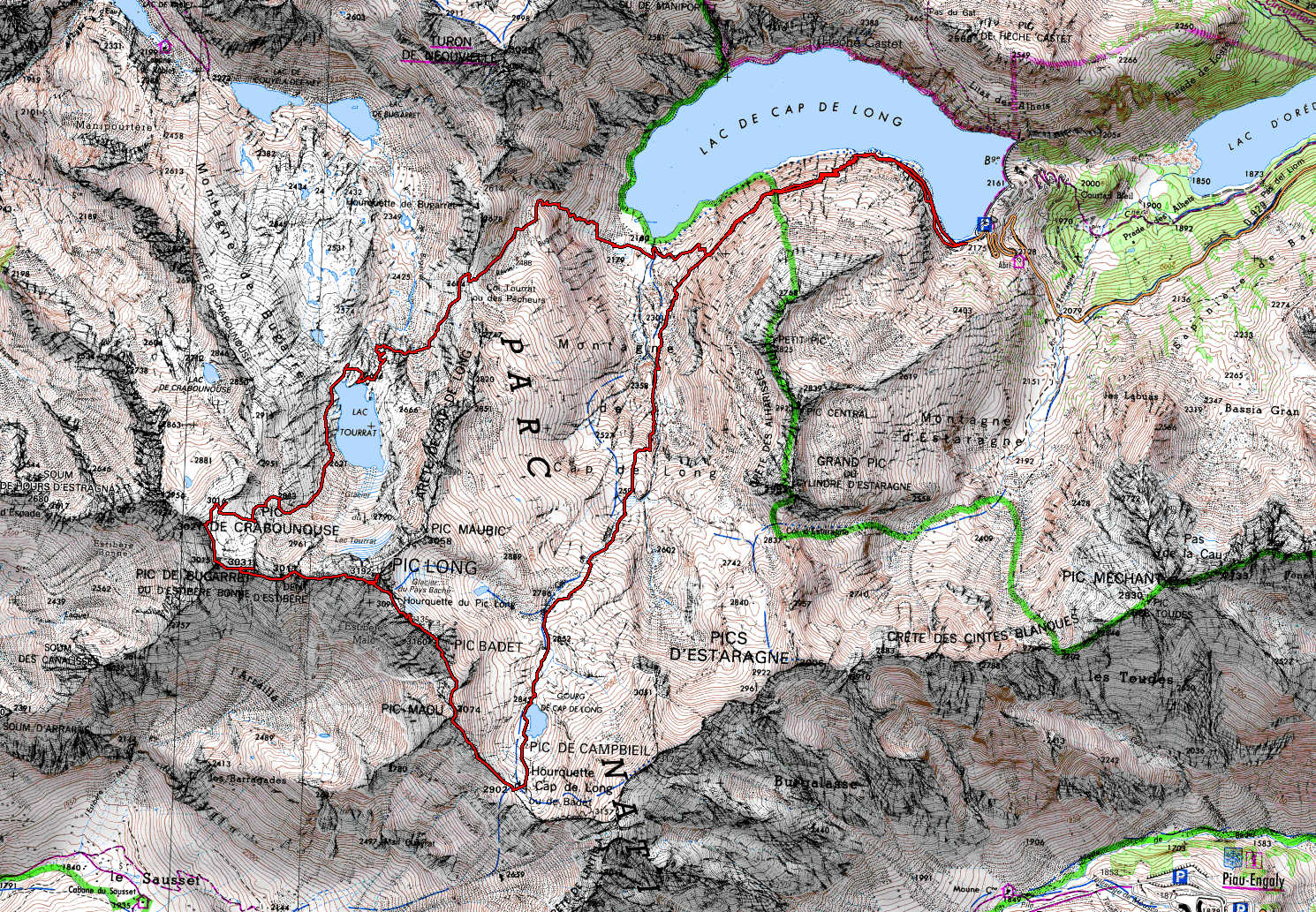 Barrage de Cap de Long 2175 m - Hourquette de Cap de Long 2902 m - Pic Maou 3074 m - Pic Badet 3160 m - Pic Long 3192 m - Dent d'Estibere-Male 3017 m - Pic de Bugarret 3031 m -