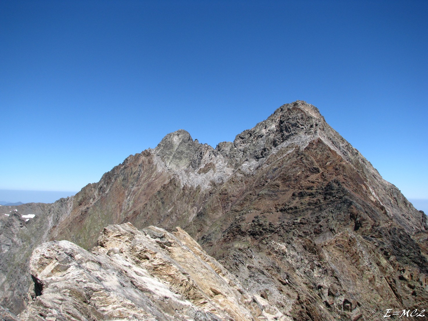 Du barrage de Cap de Long, direction la Hourquette de Cap de Long par le sentier en rive sud du lac puis en remontant la Montagne de Cap de Long. À la hourquette, suivre le fil de l’arête. En approchant du Pic Maou, je trouve le ressaut rocheux vertical peu engageant, mais comme me l’avait dit un pyrénéiste rencontré quinze jours plus tôt au Pic d’Estaragne, « ça passe à l’aise ». Je laisse mon sac au pied du ressaut et je grimpe « pas trop à l’aise » IV-, rocher pas rassurant, je récupère mon sac avec la corde. La sortie du Pic Maou se fait par une dalle déversante pour atteindre la brèche au nord de celui-ci. Poursuivre sur le fil de l’arête jusqu’au col qui précède le Pic Badet, plusieurs pas de II et III. La montée au Pic Badet se fait plus facilement et ensuite suivre les cairns pour rejoindre la Hourquette du Pic Long. De la hourquette, suivre une sorte de vire versant ouest puis une cheminée pour finir de monter au sommet du Pic Long.