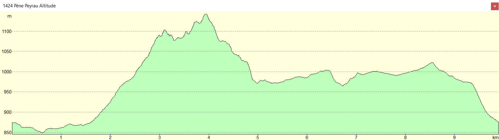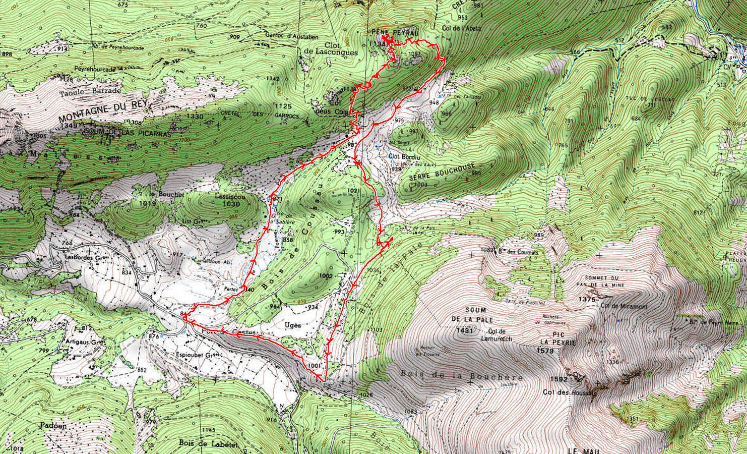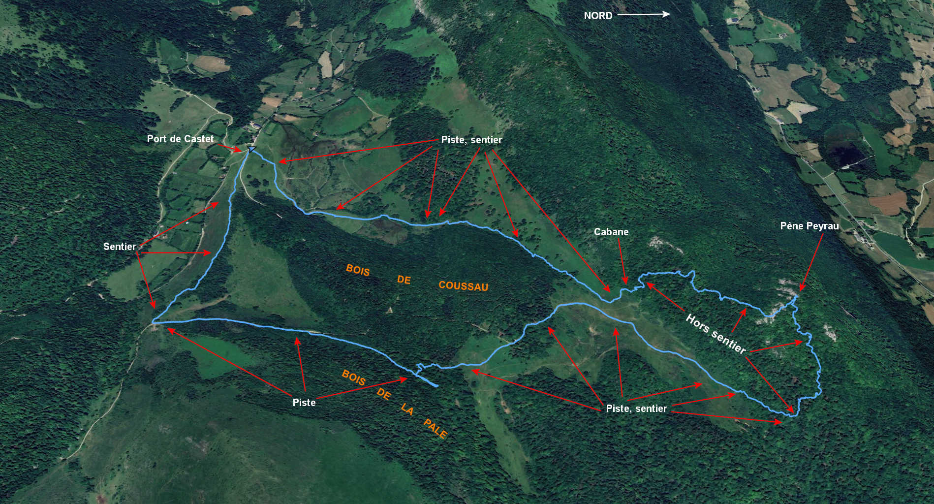 Port de Castet 867 m - Col 984 m - Cabane 1010 m - Début hors sentier 1040 m - Pène Peyrau 1134 m - Sentier 980 m - Bois de la Pale 995 m - Port de Castet 867 m