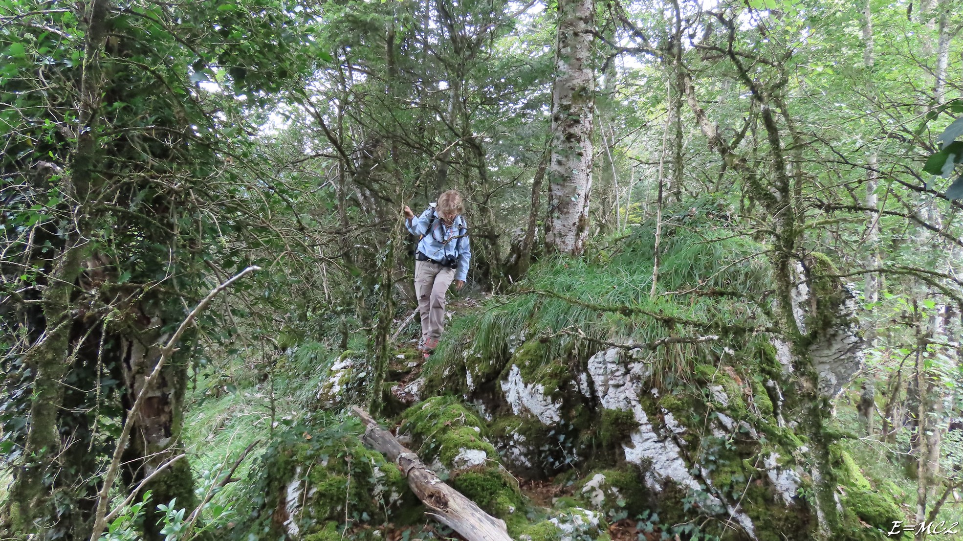 Du Pène Peyrau, on est descendu vers l’est, vers le Col de l’Abeta et, avant celui-ci vers 1030 m, on a obliqué au sud pour récupérer un ancien sentier qui nous a permis de sortir du bois. Tout cela se faisant dans l’improvisation. À la sortie du bois, poursuivre par la piste, elle revient au plateau en dessous de la cabane.