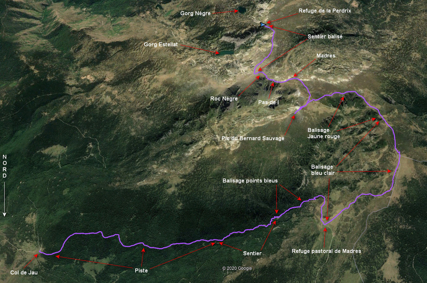 Du Col de Jau prendre la piste barrée démarrant à côté d’une stèle posée sur un gros rocher. Après un peu plus de 4 kilomètres, 1 heure du point de départ la piste décrit un large virage à droite pour passer rive gauche du ruisseau de l’Aiguette. Ne pas rentrer dans ce virage, prendre sur la gauche ce qui semble être une ancienne piste forestière, puis après quelques minutes un sentier menant à une clairière. Aller jusqu’au bout de cette clairière en se rapprochant progressivement du ruisseau de l’Aiguette. Chercher un sentier avec balisage par points bleus, toujours rive droite du ruisseau. Rester rive droite jusqu’à sortir la Forêt de Lapazeuil au Clottes de Madres, obliquer alors au nord pour rejoindre le Refuge Pastoral de Madres.