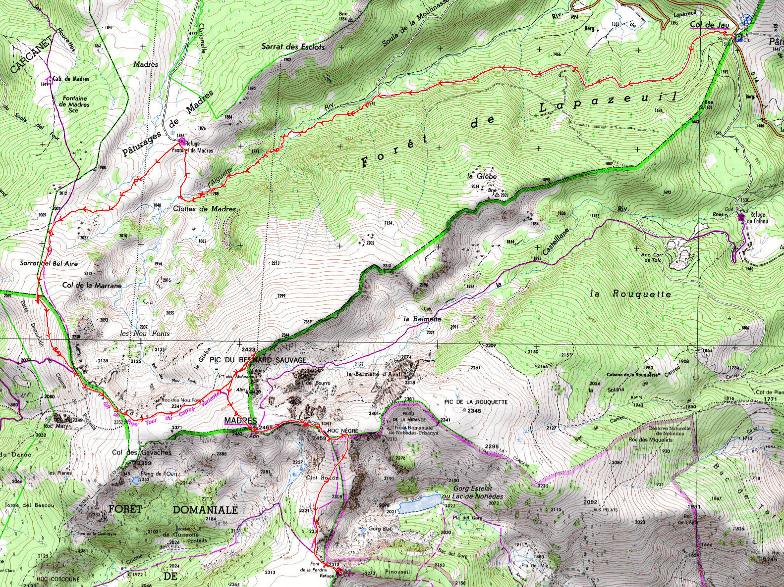 Col de Jau 1506 m - Refuge pastoral de Madres 1865 m - Pic du Bernard Sauvage 2423 m - Madres 2469 m - Roc Nègre 2459 m - Refuge de la Perdrix 2292 m