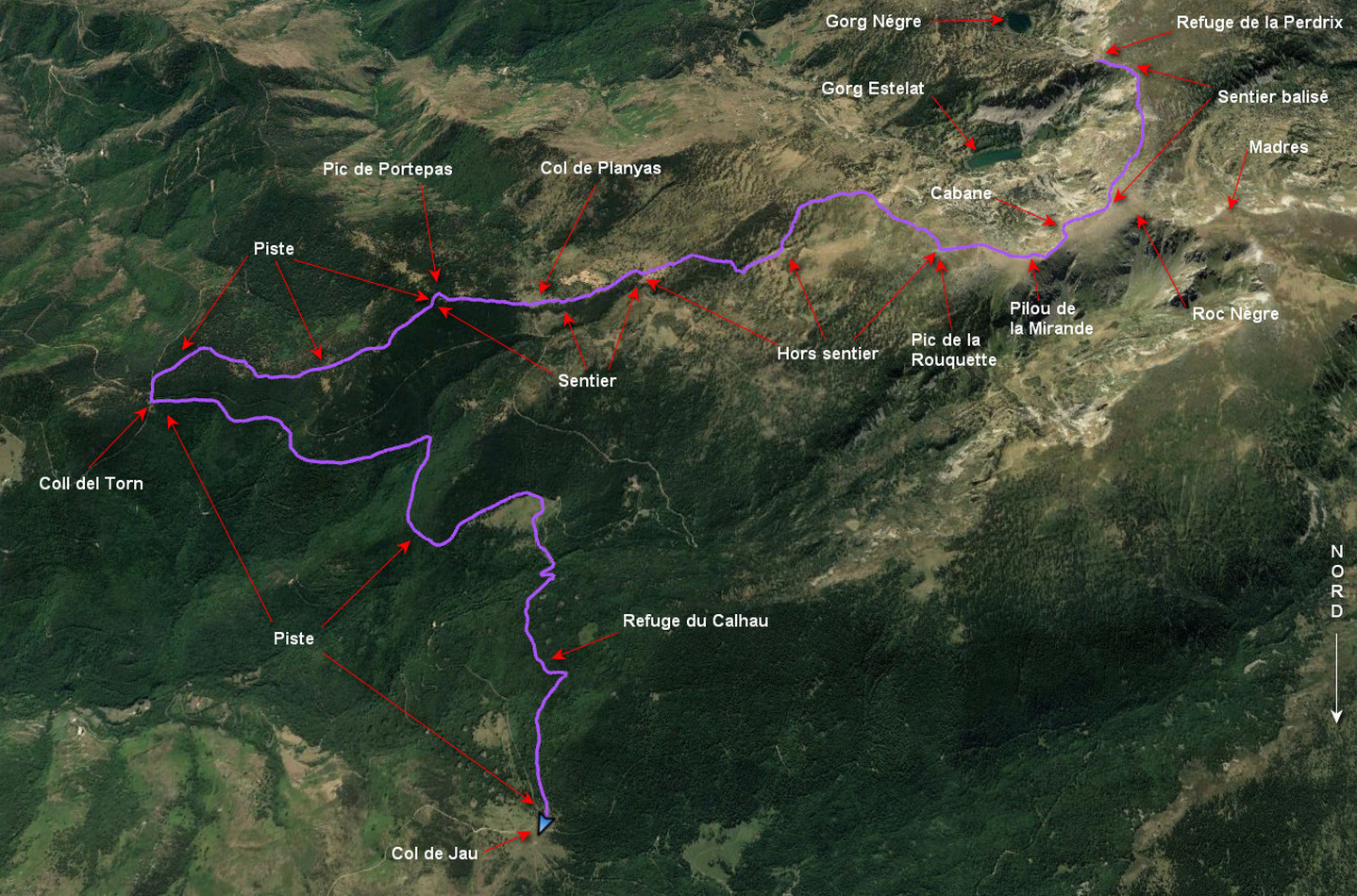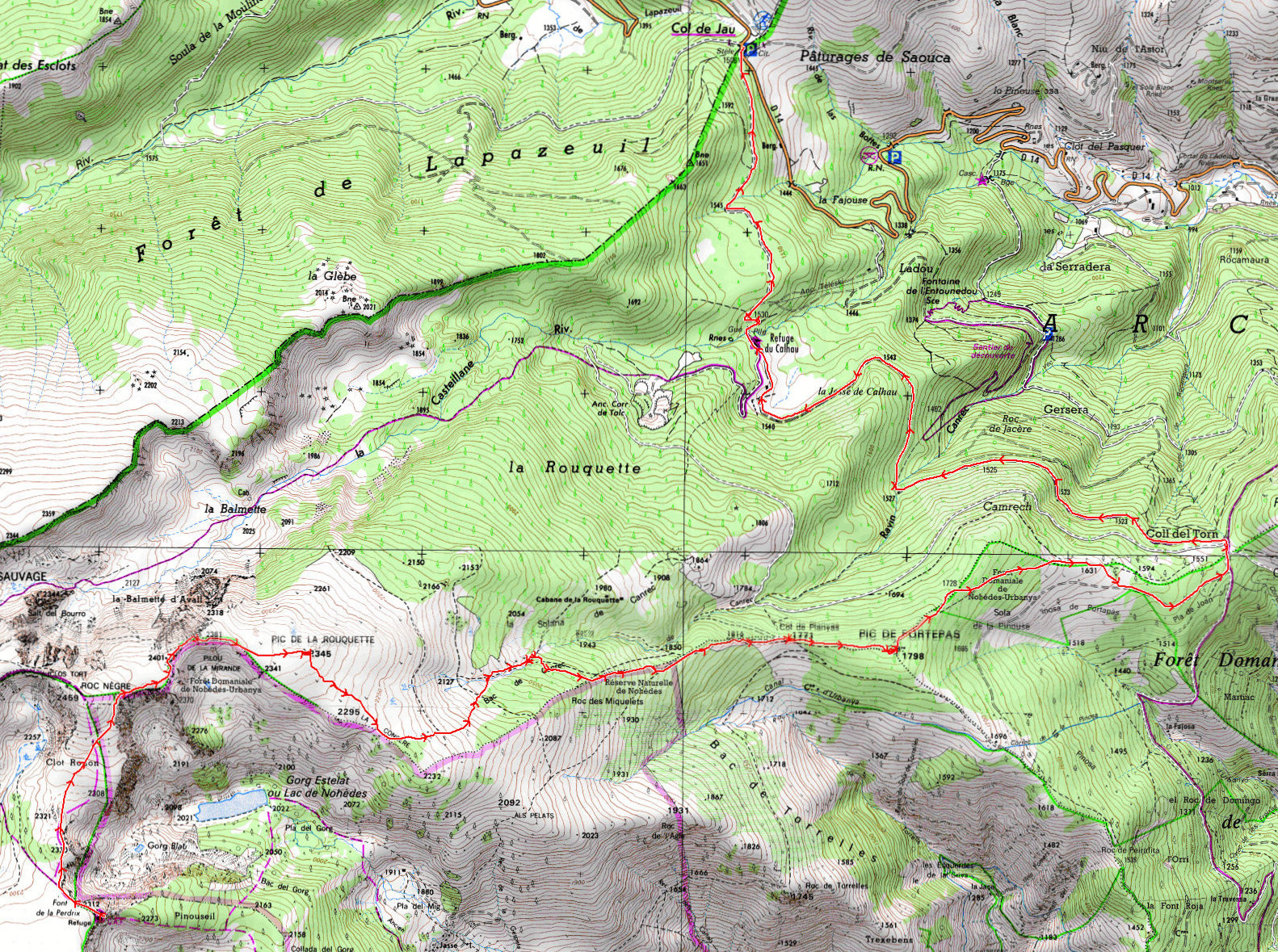 Refuge de la Perdrix 2292 m - Pilou de la Mirande 2381 m - Pic de la Rouquette 2345 m - Col de Planyas 1771 m - Pic de Portapas 1798 m - Coll del Torn 1530 m - Col de Jau 1506 m