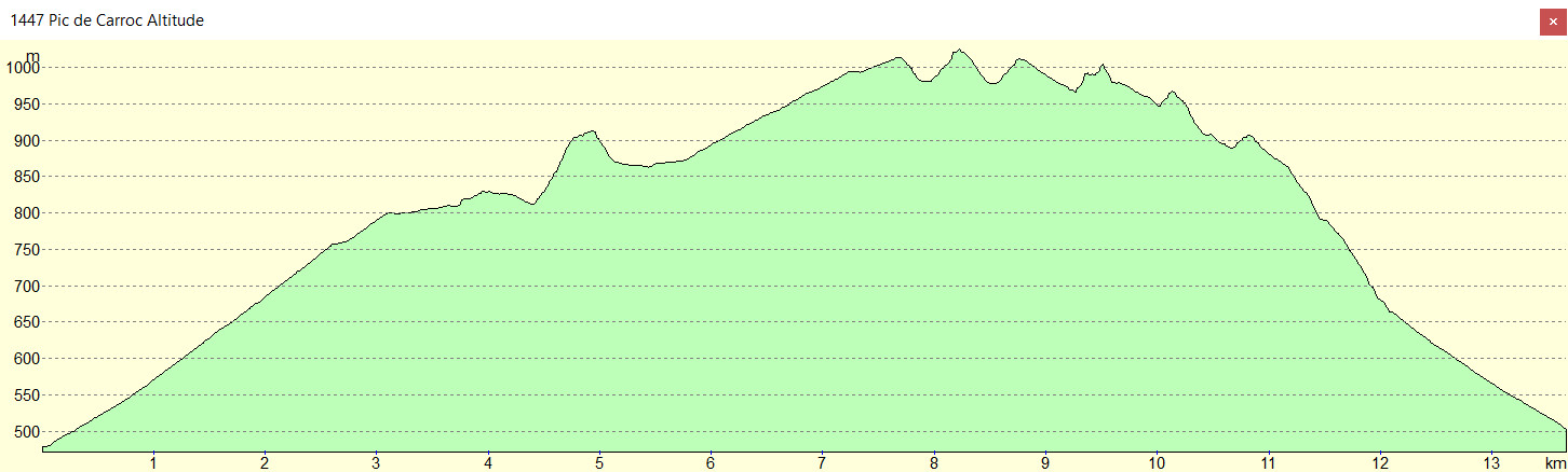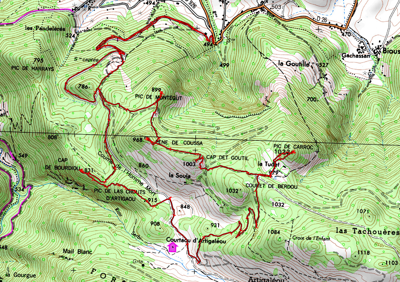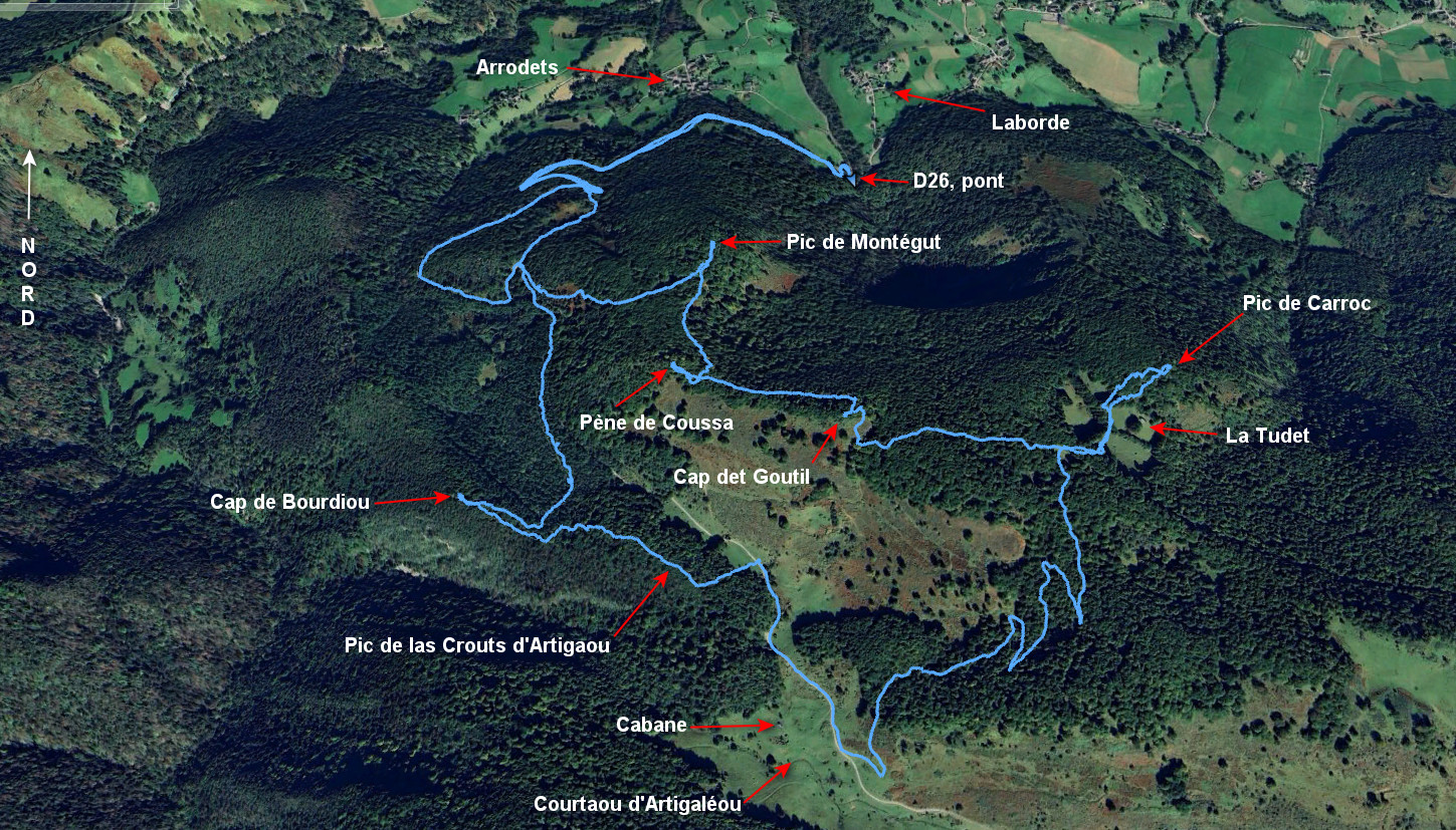 Laborde 494 m - Point 802 m - Cap de Bourdiou 831 m - Col 810 m - Pic de las Crouts d’Artigaou 915 m - Piste 870 m - Courtaou d'Artigaléou 869 m - Couret de Berdou 1010 m - Pic de Carroc 1022 m -