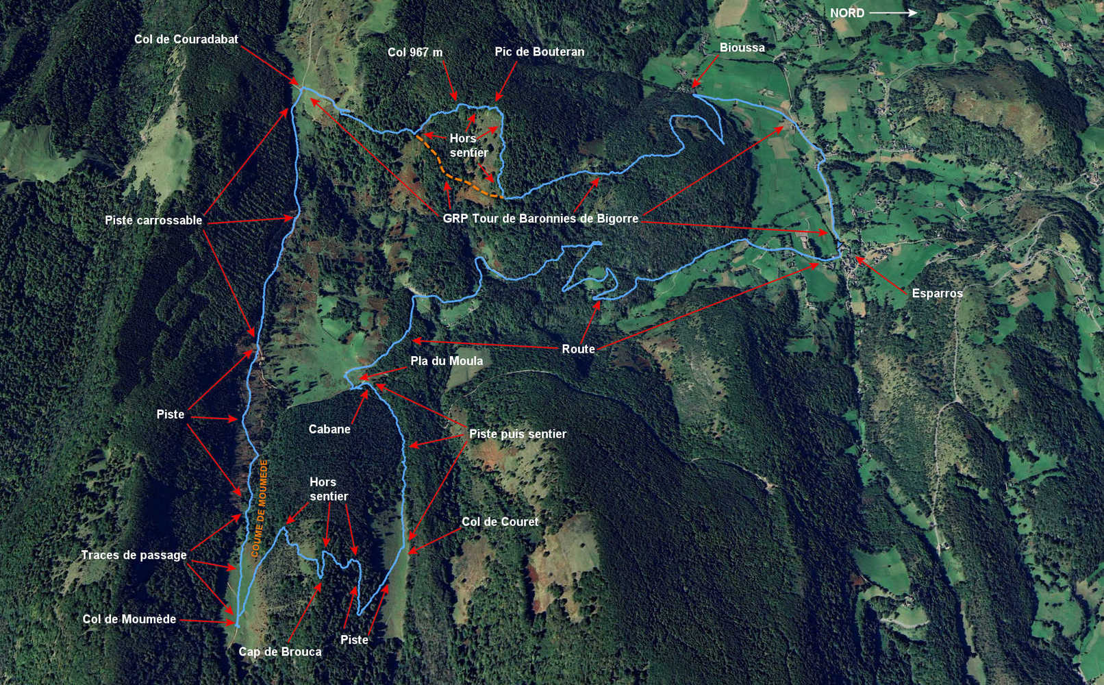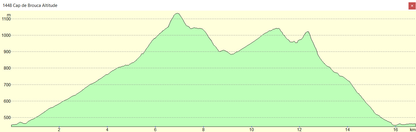 Esparros 450 m - Pla du Moula 810 m - Col de Couret 985 m - Cap de Brouca 1136 m - Col de Moumède 1042 m - Bifurcation 900 m - Piste 880 m - Col de Couradabat 1028 m - Bifurcation 950 m -