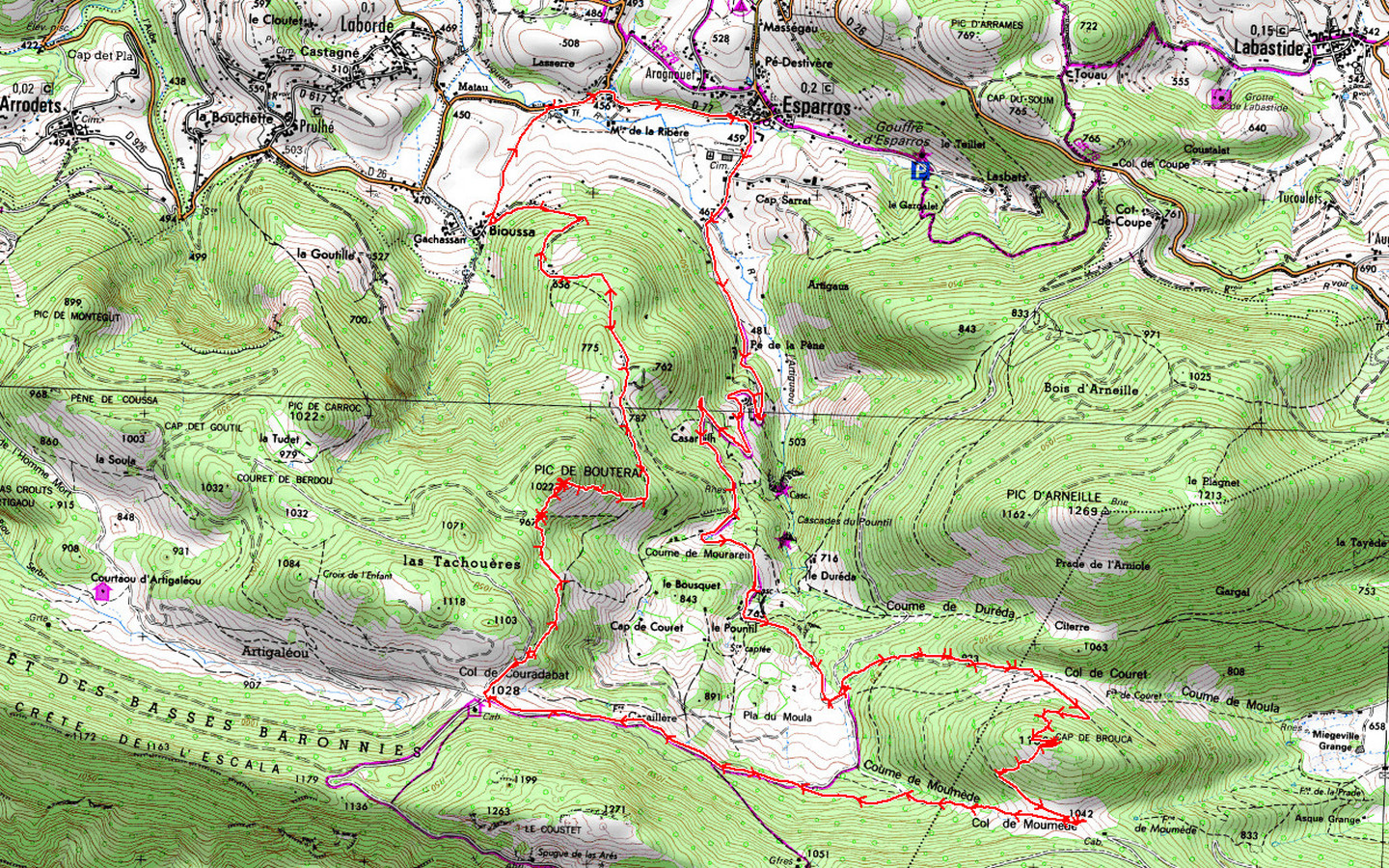 Col 967 m - Pic de Bouteran 1022 m - GRP 850 m - Bioussa 510 m - D26 450 m - Esparros 450 m