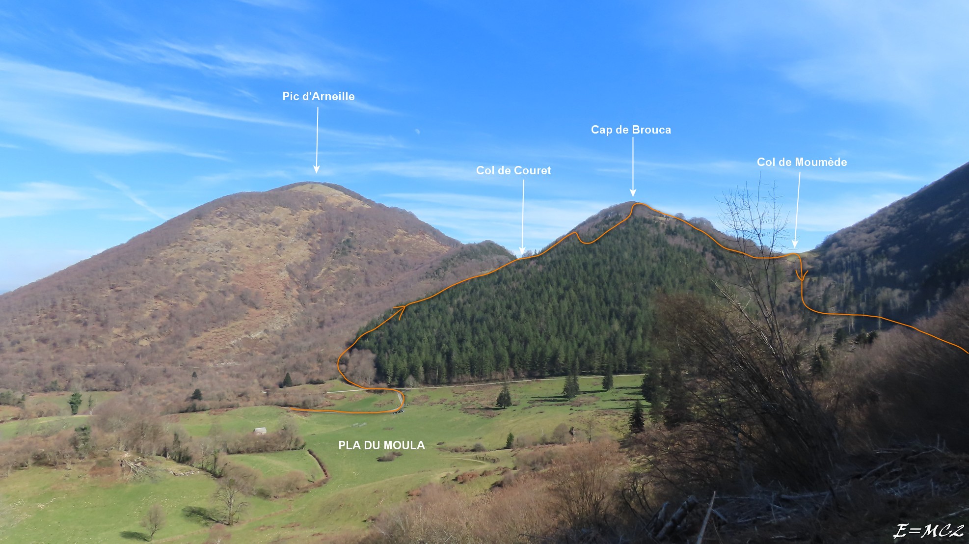 Descendre du Cap de Brouca sur son versant sud en suivant des traces de passages jusqu’à rejoindre un bon sentier qu’on a suivi vers la gauche pour aller au Col de Moumède. De ce col, descendre dans la Coume de Moumède, versant ouest du col, sans vrai sentier mais en suivant des traces dans un premier temps puis une pista dans un deuxième. Vers 890 m d’altitude, obliquer sur la gauche pour rejoindre la piste de Col de Couradabat un peu au-dessus de du Pla du Moula et monter au col.