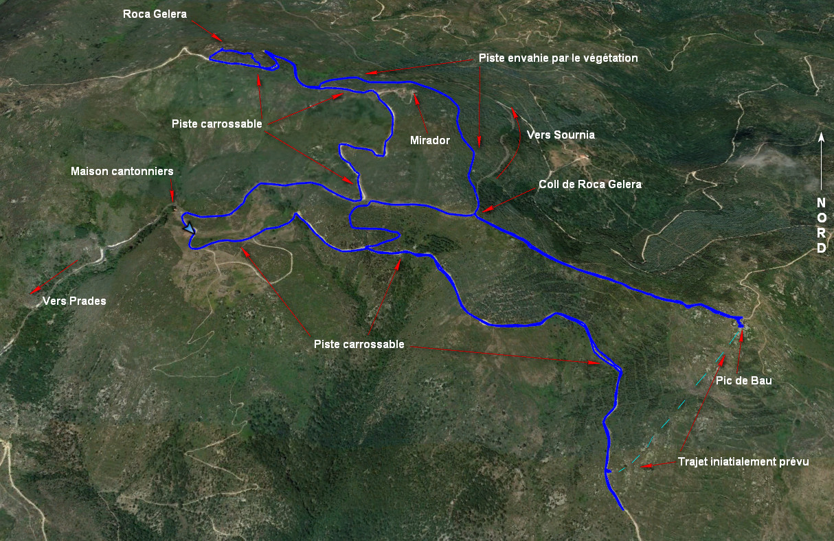 De la Maison des cantonniers, prendre la piste interdite, prendre la première piste à gauche et faire 700 mètres environ pour trouver une autre piste sur la gauche bien envahie par la végétation pour rejoindre la route*, tourner à droite, aller jusqu’au Coll de Roca Gelera et prendre sur la droite la piste descendant dans un premier temps puis remontant jusqu’au Pic de Bau (antenne relais), sommet rocheux où quelques pas d’escalade facile sont nécessaires.