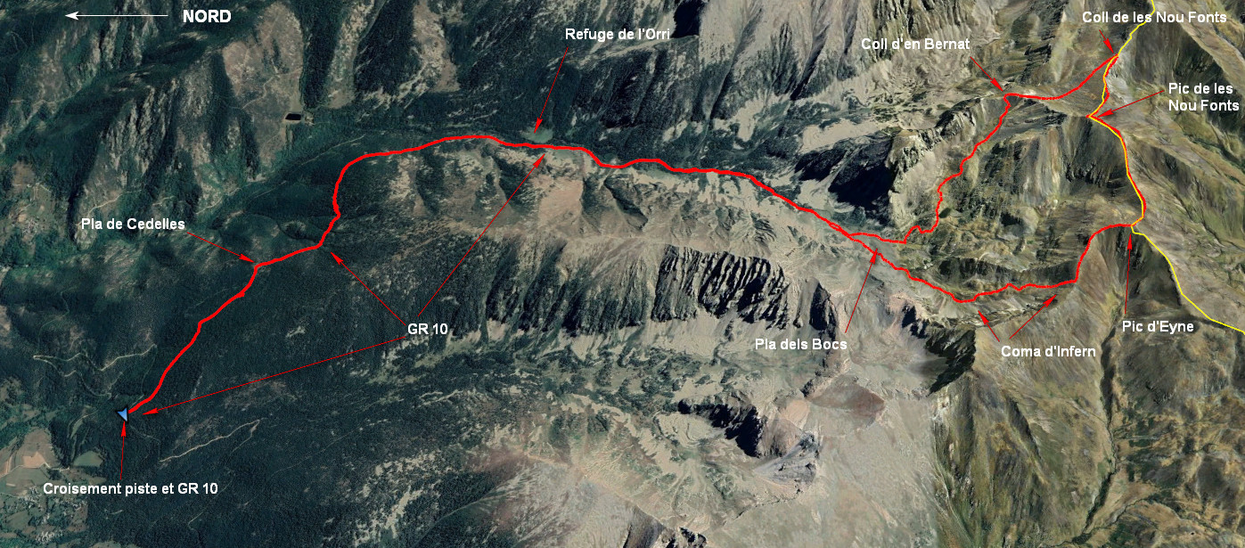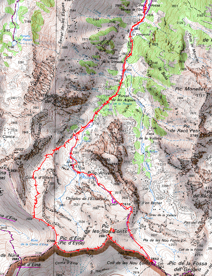 Forêt de Planès 1740 m - Pla des Cedelles 1911 m - Jassa Grossa 1826 m - Pla dels Bocs 2200 m - Coma d'Infern 2400 m - Col 2668 m - Pic d'Eyne 2786 m - Col 2734 m - Pic de les Nou Fonts 2861 m - Col de les Nou Fonts 2652 m -