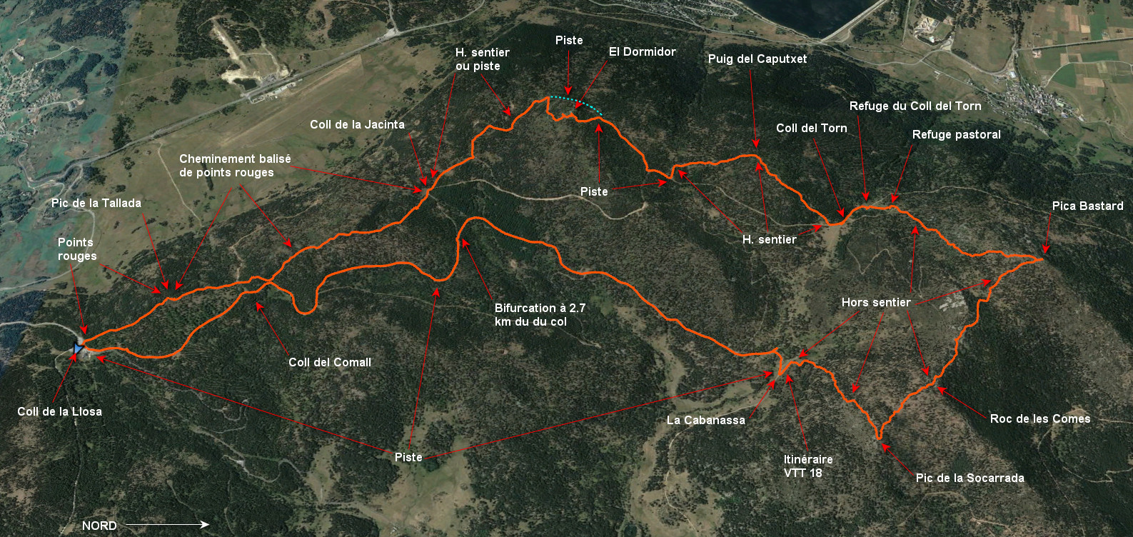 Descendre droit au sud puis au sud-ouest toujours en zigzaguant entre les genets pour rejoindre le Refuge du coll del Torn, puis le Coll del Torn à quelques minutes du refuge. Du col prendre la direction du Coll de la Llosa sur deux cents mètres environ puis obliquer à droite, au sud-ouest, pour monter dans la forêt au Puig del Caputxet. Descendre au sud, rejoindre la piste, passer une barrière, faire une centaine de mètres et prendre une piste en herbe sur la droite, faire 500 m environ puis rentrer sur la gauche dans le bois en suivant des marquages trait rouge sur bande blanche jusqu’au sommet d’el Dormidor. Revenir sur la piste et la suivre jusqu’à un panneau explicatif sur la marmotte et prendre sur la droite l’itinéraire raquettes 14 jusqu’au Coll de la Jacinta. Laisser la piste pour continuer en face et laisser l’itinéraire raquette 14 sur la gauche pour continuer par le sentier balisé par les marquages trait rouge sur bande blanches et une quantité absurde de points rouges. Rester sur la ligne de crête jusqu’au Coll de la Llosa via le Pic de la Tallada.