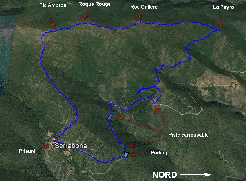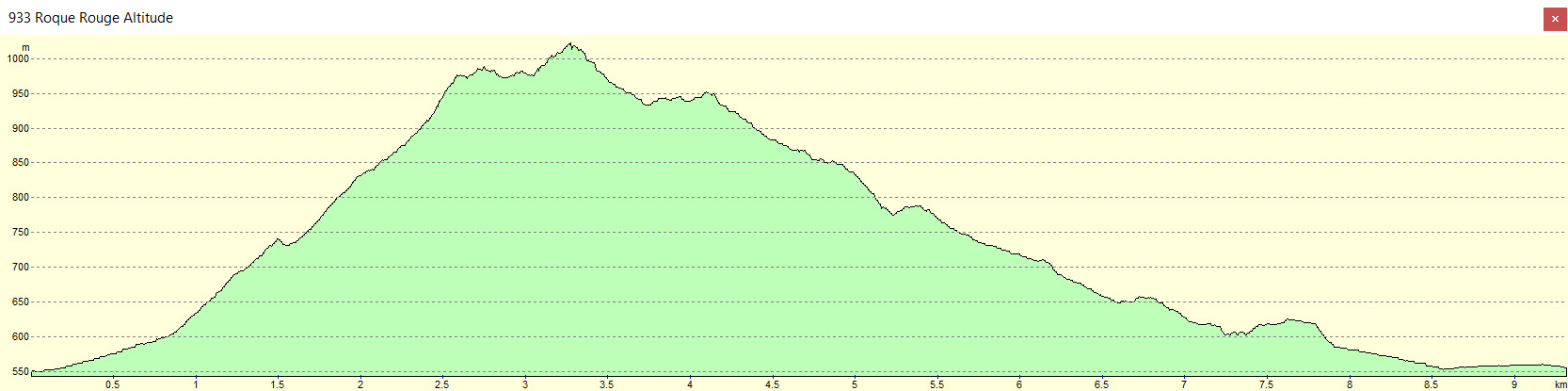 Virage avant Prieuré de Serrabona 550 m - Prieuré de Serrabona 601 m - Crête 976 m - Pic Ambrosi 981 m - Col 973 m - Roque Rouge 1015 m - Col 933 m - Roc Grillère 952 m - Lo Peyro 786 m -